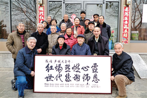 今年86歲盧斌元、83歲的鄭志新兩位老人上個世紀(jì)五、六十年代在忻府區(qū)董村鎮(zhèn)令歸村小學(xué)擔(dān)任小學(xué)老師,他們可謂桃李滿天下,所教的學(xué)生后來大多都是機(jī)關(guān)、廠礦、學(xué)校、農(nóng)村的佼佼者,如今這些學(xué)生都已是古稀老人了。2月25日上午,18位接受過兩位老師教育的令歸村“古稀學(xué)生”特邀恩師座談,共敘尊師重教之情,并向兩位恩師分別贈送了題有“紅燭點燃心靈、世代感謝師恩”的書法牌匾。兩位白發(fā)蒼蒼的耄耋老師十分激動。(魯明強(qiáng) 攝影報道)