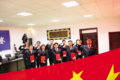 2 月25 日,岢嵐縣檢察院舉辦首批入額檢察官宣誓儀式。該院是忻州市檢察系統(tǒng)2015 年司法體制改革首批試點(diǎn)單位。一年以來,經(jīng)過層層選拔,首批10 名檢察官脫穎而出,市檢察院和岢嵐縣人大、政協(xié)領(lǐng)導(dǎo)到場祝賀,希望入額檢察官擔(dān)當(dāng)重任,充分發(fā)揮職能作用,維護(hù)好社會公平正義。(程玉光 攝)