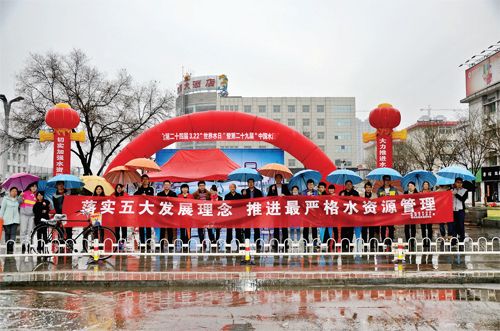3月22日是第24屆“世界水日”,也是第29屆“中國水周”,市水利局、水資辦、綠色地球協(xié)會冒著瀝瀝小雨聯(lián)合在城區(qū)日月廣場舉行紀念活動。(馬月林 攝)