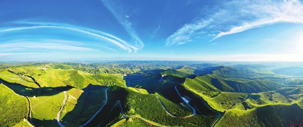 蒼翠欲滴的綠意,如潑墨般點染著黃土高原的溝壑梁峁,交織成一片生機盎然的“生態(tài)絨毯”。蜿蜒起伏的古長城和玉帶般優(yōu)雅伸展的長城一號旅游公路,形成一幅美不勝收的圖景。圖為長城一號旅游公路偏關(guān)段。(記者 馮曉磊攝)