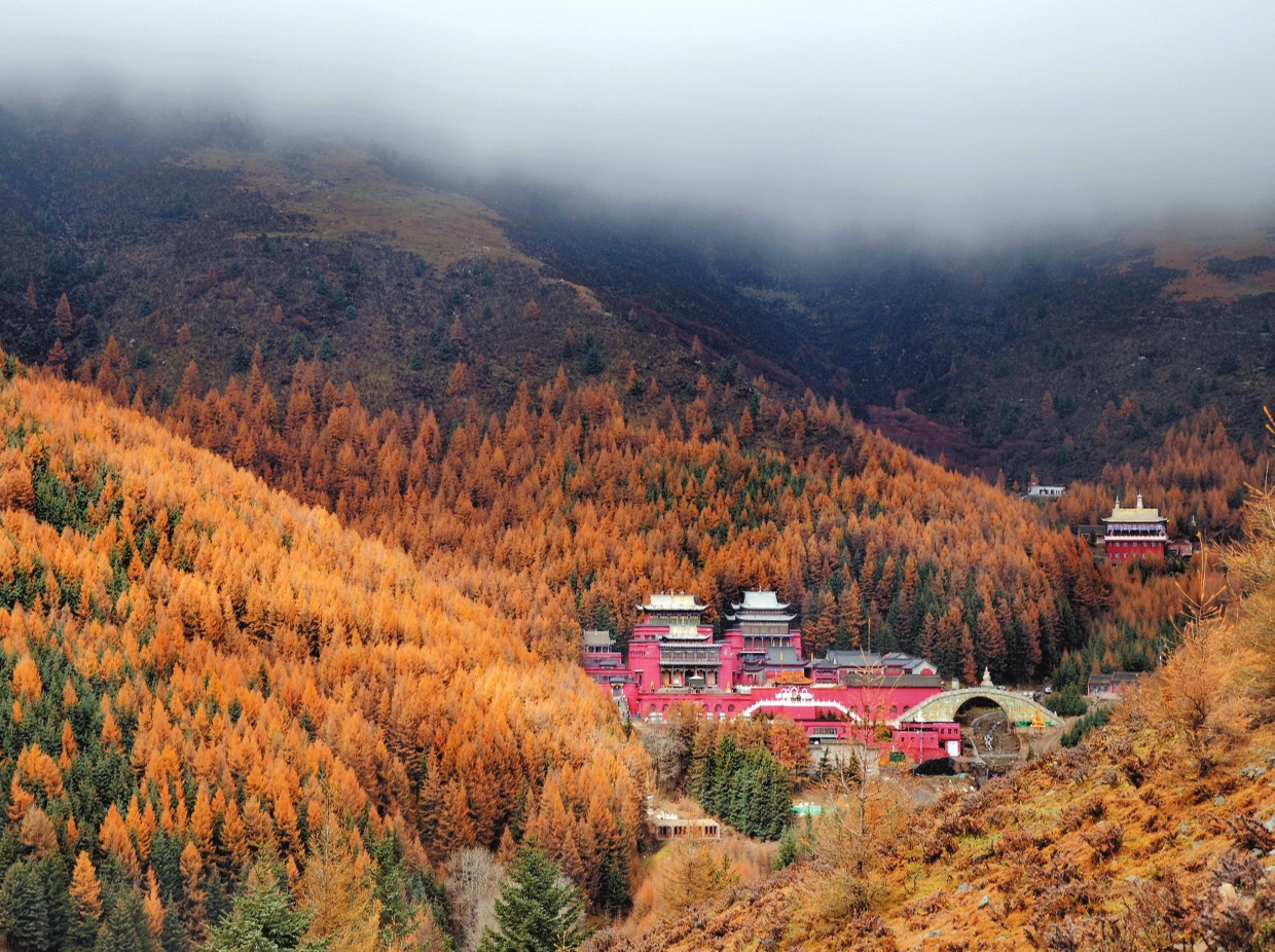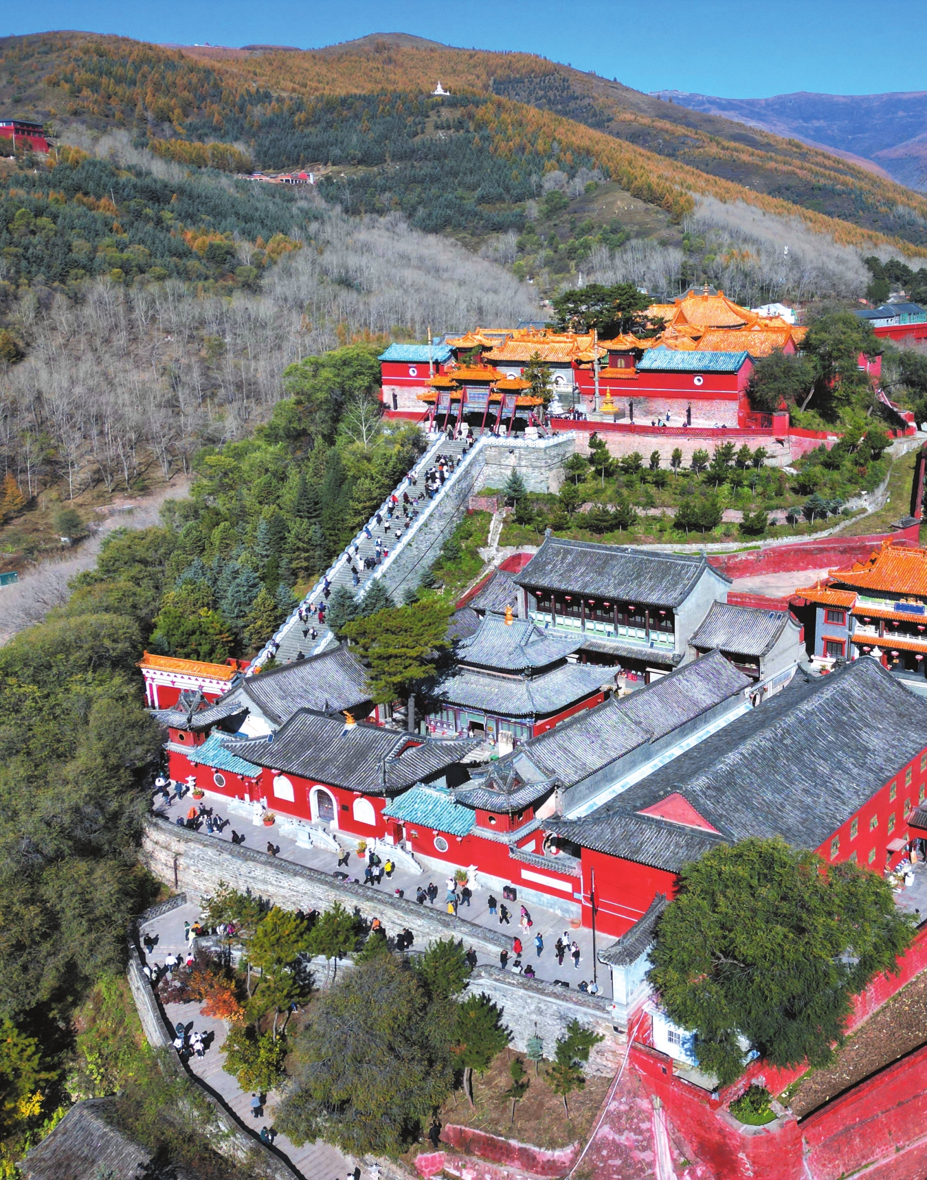 秋季已近尾聲,五臺山的秋色卻進(jìn)入最絢爛的篇章。漫山松柏與闊葉林褪去翠綠,換上金色、赤紅與橙黃的華服,與千年古剎的紅墻黛瓦相映成景,吸引海內(nèi)外游客共赴這場秋日禪意之約。