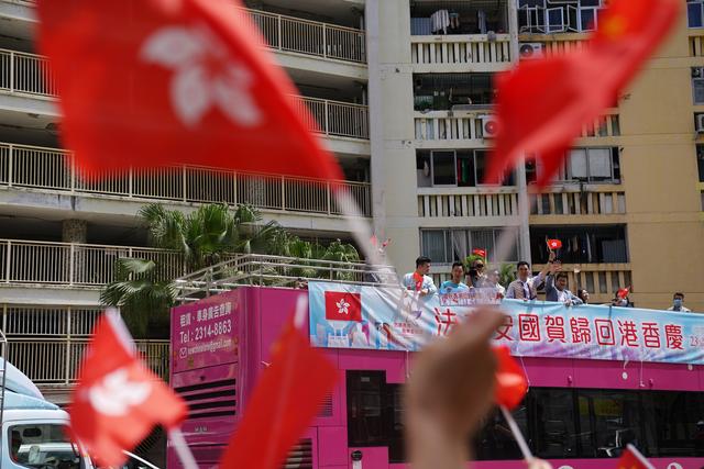 7月1日,市民揮舞國旗、區(qū)旗和巡游巴士互動。新華社記者王申 攝