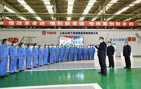 2020年5月11日至12日,中共中央總書(shū)記、國(guó)家主席、中央軍委主席習(xí)近平在山西考察。這是5月12日上午,習(xí)近平在太鋼不銹鋼精密帶鋼有限公司生產(chǎn)車(chē)間考察時(shí),同企業(yè)職工親切交流。 新華社記者 謝環(huán)馳攝