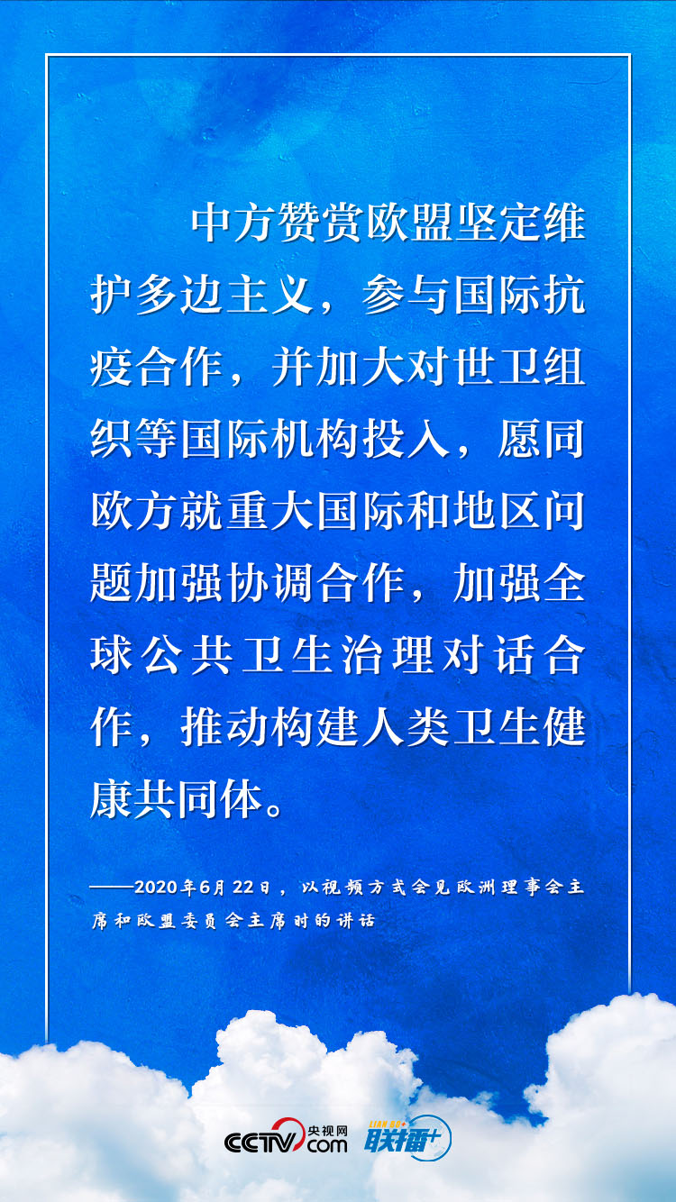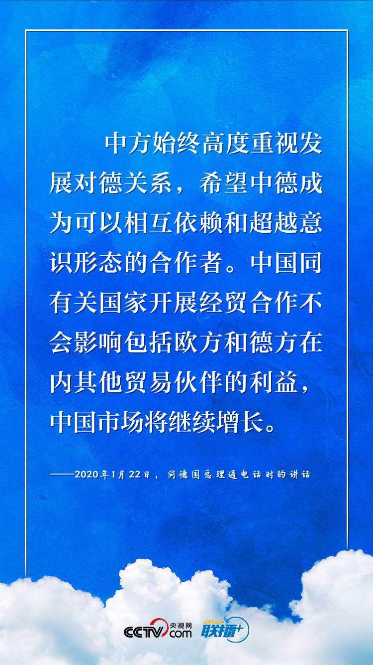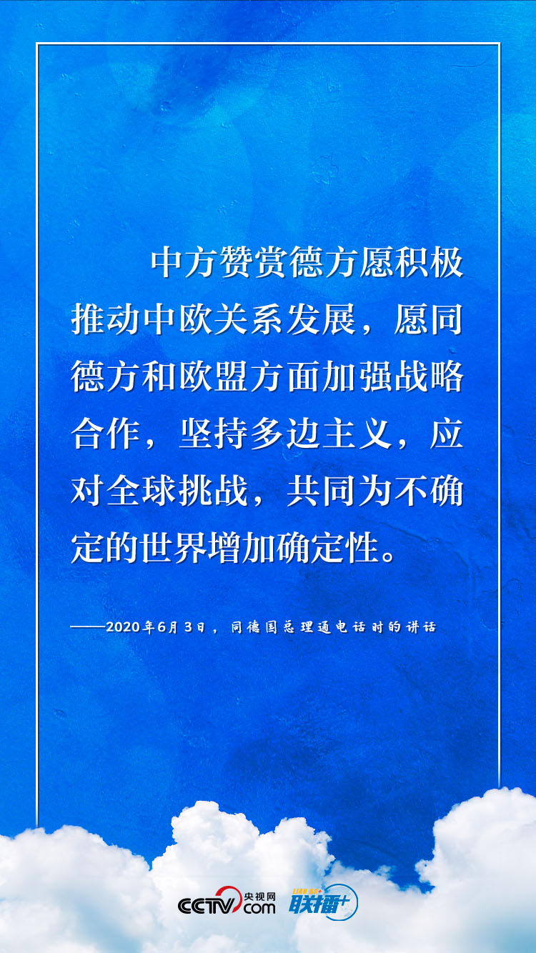 9月14日,習近平主席將以視頻方式同德國總理默克爾、歐洲理事會主席米歇爾、歐盟委員會主席馮德萊恩共同舉行中德歐領(lǐng)導(dǎo)人會晤?!堵?lián)播+》梳理今年以來習近平主席與德國、歐盟領(lǐng)導(dǎo)人“云外交”的部分講話,與您共同感受團結(jié)合作中蘊藏的深遠意義。