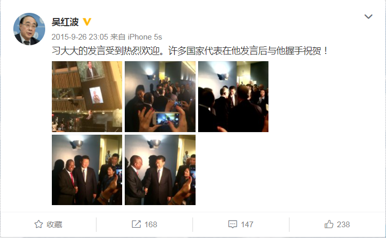 時(shí)任聯(lián)合國副秘書長吳紅波說,習(xí)主席走下講臺(tái)時(shí),二三十位其他國家領(lǐng)導(dǎo)人排隊(duì)與他握手表示祝賀,走廊里擠得滿滿當(dāng)當(dāng)。