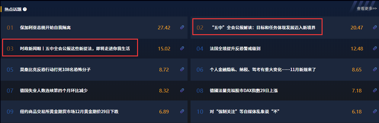 運(yùn)用央視網(wǎng)“智聞”系統(tǒng)對(duì)30日全網(wǎng)新聞熱點(diǎn)進(jìn)行抓取,在熱點(diǎn)話題一欄,全會(huì)公報(bào)相關(guān)報(bào)道穩(wěn)居話題榜前列,相關(guān)報(bào)道也引起廣大網(wǎng)友的熱議。