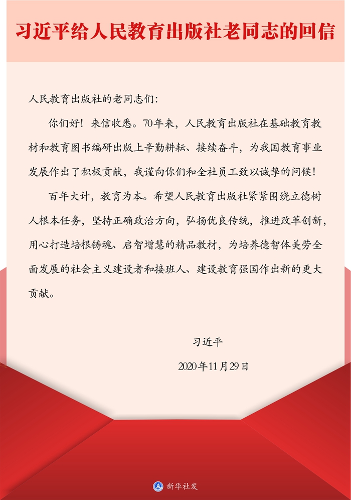 你們好!來信收悉。70年來,人民教育出版社在基礎(chǔ)教育教材和教育圖書編研出版上辛勤耕耘、接續(xù)奮斗,為我國教育事業(yè)發(fā)展作出了積極貢獻(xiàn),我謹(jǐn)向你們和全社員工致以誠摯的問候!