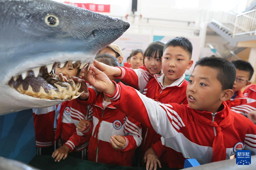 9月8日,在甘肅省定西市舉辦的“山海相依,筑夢蔚藍”山東青島·甘肅定西海洋科普東西部協(xié)作主題活動中,定西市安定區(qū)關(guān)川實驗學校的學生在觀看海洋生物標本。(新華社發(fā) 王克賢 攝)