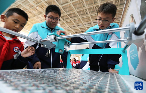 9月8日,在甘肅省定西市舉辦的“山海相依,筑夢蔚藍”山東青島·甘肅定西海洋科普東西部協(xié)作主題活動中,定西市安定區(qū)關(guān)川實驗學校的學生在流動科技館內(nèi)體驗科普裝置。(新華社發(fā) 王克賢 攝)