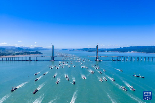 9月16日,漁船駛過浙江省寧波市象山港大橋開赴東海作業(yè)(無人機照片)。(新華社發(fā) 張輝 攝)