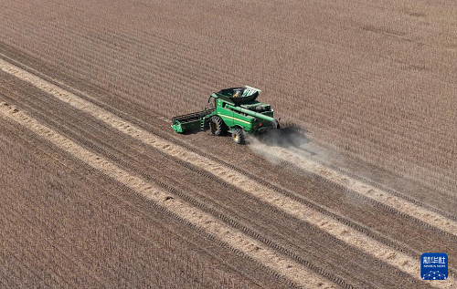 9月23日,在黑龍江北大荒農業(yè)股份有限公司友誼分公司一旱田地塊,大型農業(yè)機械在進行大豆收獲作業(yè)(無人機照片)。(新華社記者 王松 攝)