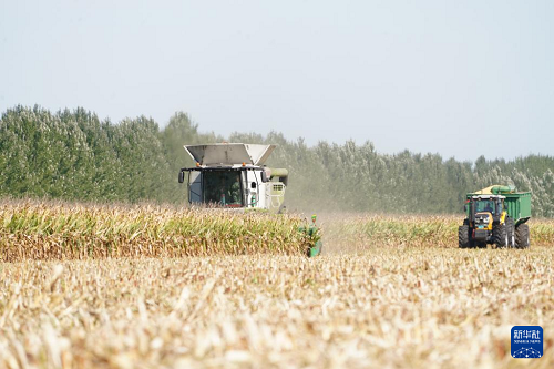 9月23日,在黑龍江北大荒農業(yè)股份有限公司友誼分公司一旱田地塊,大型農業(yè)機械在進行玉米收獲作業(yè)。(新華社記者 王松 攝)