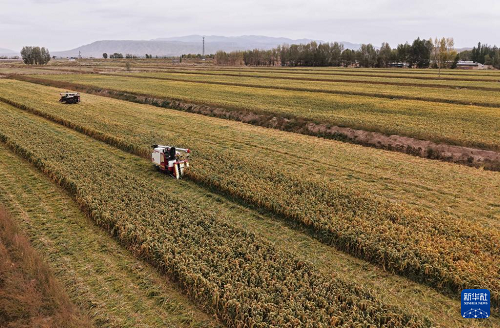 9月24日,收割機(jī)在甘肅省張掖市山丹縣位奇鎮(zhèn)暖泉村收割谷子。(新華社發(fā) 陳禮 攝)