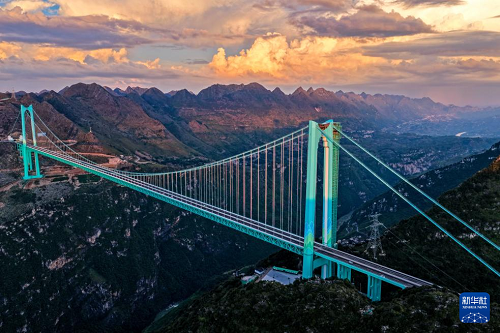 9月28日拍攝的夕陽(yáng)下的貴州花江峽谷大橋(無(wú)人機(jī)照片)。(新華社記者 楊文斌 攝)