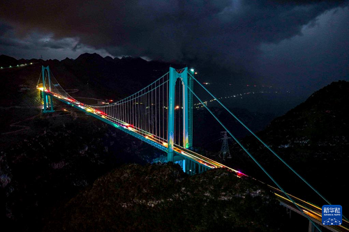 9月28日拍攝的夜幕下的貴州花江峽谷大橋(無(wú)人機(jī)照片)。(新華社記者 楊文斌 攝)