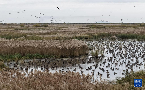 10月13日,在黑龍江省雞西市密山市興凱湖國(guó)家級(jí)自然保護(hù)區(qū),一群候鳥在濕地中覓食(無(wú)人機(jī)照片)。(新華社發(fā) 孫海淇 攝)
