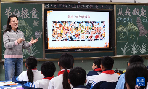 10月15日,河南省商丘市夏邑縣育才學(xué)校老師在世界糧食日主題班會(huì)上講解糧食知識。(新華社發(fā) 苗育才 攝)