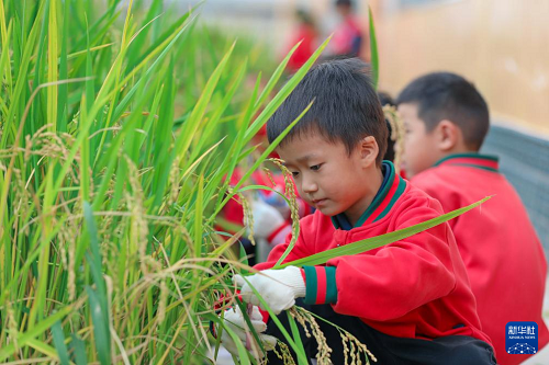 10月15日,云南省曲靖市陸良縣大莫古鎮(zhèn)中心幼兒園的孩子們在校內(nèi)勞動(dòng)基地體驗(yàn)打稻穗。(新華社發(fā) 王勇 攝)
