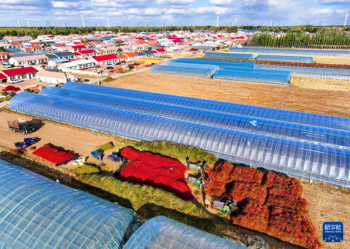 10月19日,在通遼市開魯縣東風鎮(zhèn)六合堂村,村民在分揀紅干椒(無人機照片)。(新華社記者 連振 攝)