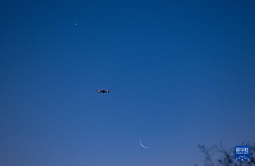 10月20日,在位于黑龍江省黑河市的北大荒集團(tuán)北安分公司趙光農(nóng)場有限公司,攝影愛好者在用無人機(jī)拍攝啟明星伴月。(新華社發(fā) 錢泊羽 攝)