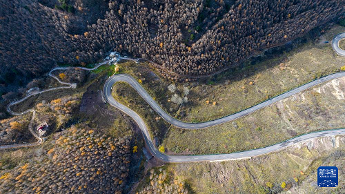10月26日在位于寧夏固原市隆德縣的寧夏六盤山紅軍長(zhǎng)征景區(qū)拍攝的秋景(無人機(jī)照片)。(新華社記者 王鵬 攝)