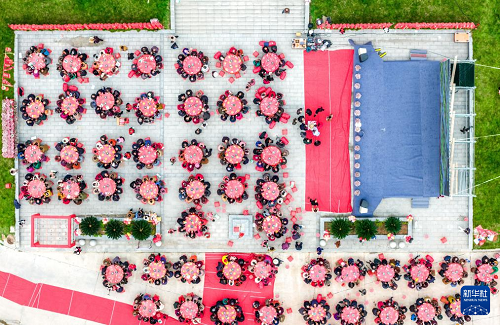10月29日重陽(yáng)節(jié),老人們?cè)诤笔★鰵w縣兩河口鎮(zhèn)太坪村參加長(zhǎng)壽宴(無(wú)人機(jī)照片)。(新華社發(fā) 王罡 攝)