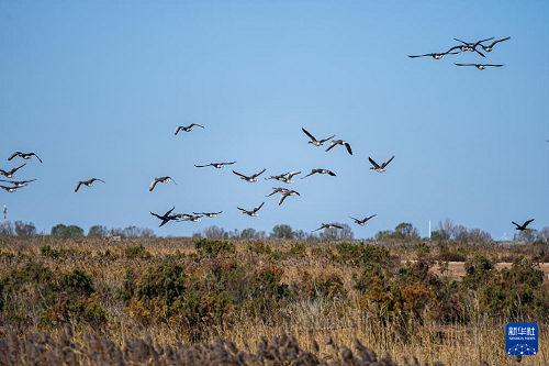 11月13日,山東黃河三角洲國家級自然保護區(qū)內,越冬候鳥在飛翔。(新華社記者 朱崢 攝)