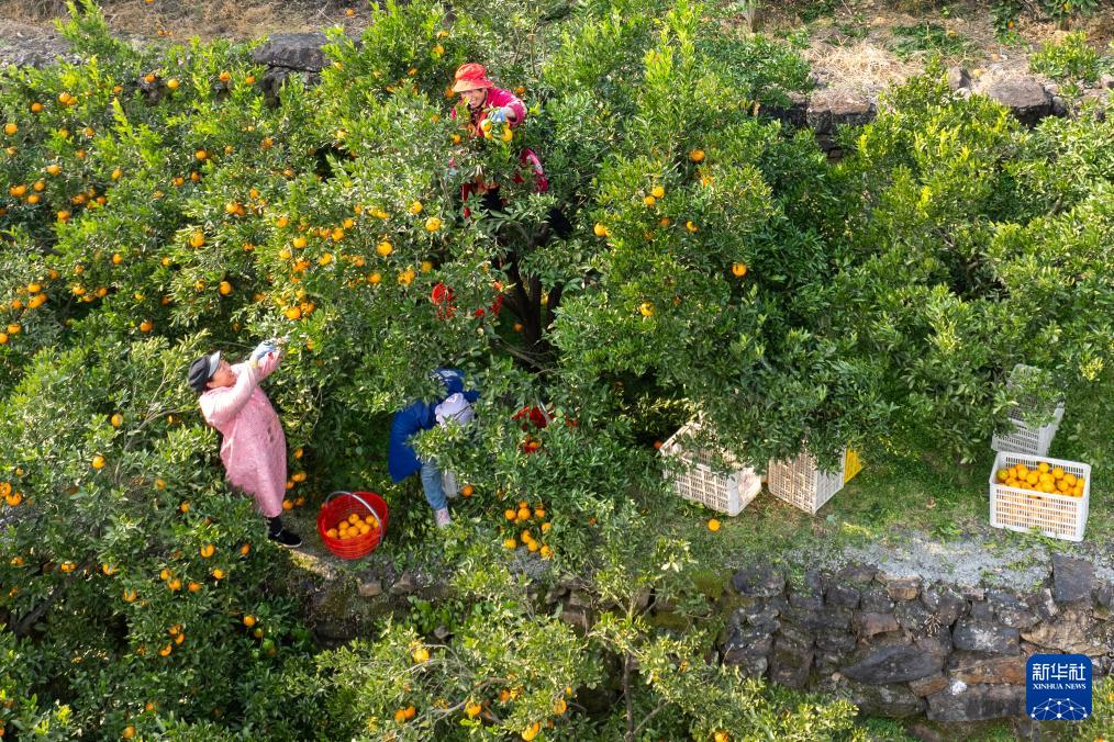 12月11日,在湖北省宜昌市長陽土家族自治縣漁峽口鎮(zhèn)巖松坪村,村民在采摘清江椪柑(無人機照片)。(新華社記者 杜子璇 攝)