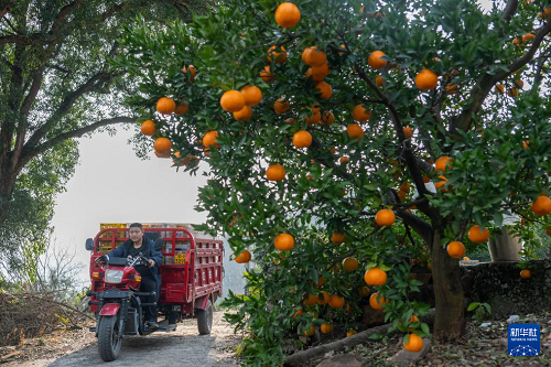 12月11日,在湖北省宜昌市長陽土家族自治縣漁峽口鎮(zhèn)巖松坪村,村民在轉運剛采摘的清江椪柑。(新華社記者 杜子璇 攝)