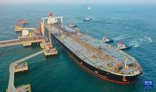 12月18日,一艘裝載著石化原輔料的外籍船舶泊入國投洋浦油儲碼頭30萬噸級原油泊位(無人機(jī)照片)。(新華社記者 郭程 攝)