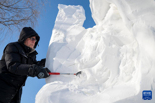1月7日,在哈爾濱太陽島雪博會園區(qū),來自13個國家的25支代表隊百余位藝術(shù)家在寒冬中堅持藝術(shù)創(chuàng)作,精雕細琢雪雕作品。