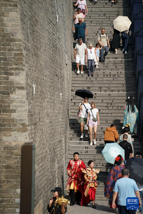 游客在西安城墻永寧門內(nèi)游覽,左側(cè)城墻上布設(shè)著城墻病害數(shù)據(jù)傳感監(jiān)測(cè)設(shè)備(2025年9月12日攝)。(新華社記者 邵瑞 攝)