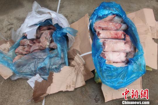 1月25日8時(shí)許,支隊(duì)瀾滄邊境檢查站執(zhí)勤官兵查獲3輛可疑貨車,當(dāng)場從車廂內(nèi)查獲用麻布袋遮蓋的冰凍雞腳、豬腳等走私凍品105噸。1月27日19時(shí)30分,普洱邊防支隊(duì)支隊(duì)黃莊查緝點(diǎn)在323國道某段開展公開查緝,查獲2輛由景洪駛往昆明的貨車,發(fā)現(xiàn)車內(nèi)拉載的冰凍鴨掌等凍品外包裝均是英文標(biāo)識,且沒有任何檢驗(yàn)檢疫及運(yùn)輸銷售等合法手續(xù)憑證,經(jīng)稱重共計(jì)9噸。如果沒有被邊防官兵查獲,那這些從境外走私入境的劣質(zhì)過期冰凍肉質(zhì)品,將在春節(jié)期間流入至少2萬戶家庭的餐桌。