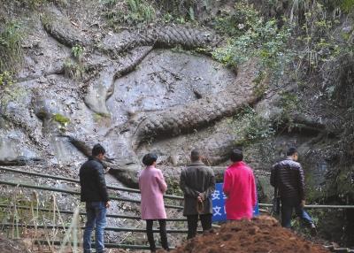 昨天,多批當(dāng)?shù)赜慰蛠淼绞埱逵倬S護(hù)工程現(xiàn)場(chǎng),觀看石龍。這些游客均稱,他們是看了網(wǎng)上關(guān)于該石龍與張獻(xiàn)忠“江口沉銀”有關(guān)系的報(bào)道后,慕名前來。