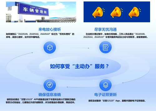 為了確?!爸鲃愚k”服務的順利推進,忻州市公安局交警支隊還提醒用戶,請及時登錄“交管12123”App查看并更新電子證照信息,同時確保在車管所登記的聯(lián)系方式和地址準確無誤。這樣,車管所不僅能夠及時與用戶溝通聯(lián)系,還能將辦理結果和證件準確無誤地寄送到用戶手中。