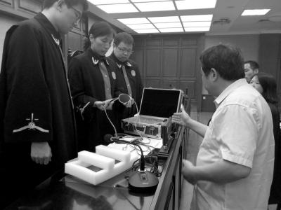 法官當(dāng)庭檢查齊某提供的理療儀,發(fā)現(xiàn)是三無(wú)產(chǎn)品。京華時(shí)報(bào)記者鄭羽佳攝