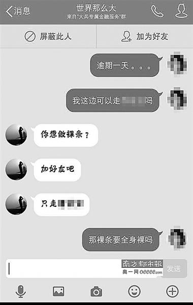 以手持身份證的裸照為抵押進(jìn)行借款 可以借款的金額是普通借款額度的2至5倍 ·風(fēng)險(xiǎn) 這些借給她的人里,全都是“假熟人” “他們說還不上就把裸照發(fā)給家人、發(fā)給朋友” ·提醒 “借貸平臺(tái)未及時(shí)刪除屏蔽,應(yīng)承擔(dān)連帶責(zé)任” “如果真拿裸照抵押給出借人,從法律上來講是無效的” 據(jù)新華社、北京青年報(bào)、南方都市報(bào) ① 活躍在借貸寶平臺(tái)的中介 ②③ 記者與自稱可提供服務(wù)的網(wǎng)貸中介的聊天記錄 ④ 借貸者在網(wǎng)上發(fā)布的裸照文件 近日,有網(wǎng)友曝光稱,通過網(wǎng)絡(luò)借貸平臺(tái)借貸寶,有女大學(xué)生被要求“裸持”(以手持身份證的裸照為抵押,也被稱為“裸條”)進(jìn)行借款,逾期無法還款將被威脅公布裸照給家人朋友,且借款周利息高達(dá)30%。 13日,記者調(diào)查發(fā)現(xiàn),在一些借款群中,女大學(xué)生“裸持”借款已經(jīng)成為公開的秘密,通過“裸持”可以借款的金額是普通借款額度的2至5倍,但逾期未還將面臨裸照被公布的威脅,甚至有借款人威脅“裸持”借款的女生提供性服務(wù)。 對于上述情況,借貸寶稱,高息、“裸持”等是用戶私下的個(gè)人行為,該公司無權(quán)干涉,并表示“出借款風(fēng)險(xiǎn)需要自擔(dān)”。 有律師表示,借貸平臺(tái)作為服務(wù)提供者,對顯而易見的違法信息負(fù)有監(jiān)測排除的義務(wù),特別是經(jīng)過借貸者反映投訴的,未及時(shí)刪除、屏蔽,應(yīng)承擔(dān)連帶責(zé)任。 “一次借一周, 一周的利息是30%” 12日晚,記者聯(lián)系上一位“裸持”的借款人林曉(化名),這個(gè)來自江蘇的女大學(xué)生現(xiàn)在正被債主威脅公布她的裸照。 林曉說,今年2月,因?yàn)閯?chuàng)業(yè)開網(wǎng)店需要進(jìn)貨,她通過“借貸寶”向平臺(tái)上的“熟人”借了500元錢?!耙淮谓枰恢?,一周的利息是30%,還的時(shí)候要還650元。”一周后,因?yàn)椤坝馄凇边€不上這些錢,林曉又在平臺(tái)上發(fā)布借款標(biāo),向其他“熟人”借錢還上第一筆借款。 所謂“熟人”是使用借貸寶的成員間的核心關(guān)系,一個(gè)人想通過借貸寶借到錢,只能向其添加為“熟人”的聯(lián)系人借錢,而其他用戶則看不到此人的借款信息。借貸寶平臺(tái)方默認(rèn)“熟人”之間是相互熟識(shí)的,所以平臺(tái)不承擔(dān)借貸風(fēng)險(xiǎn),而由借款人和出借人雙方自擔(dān)。 但是這里的“熟人”卻往往不是真正的熟人。林曉稱,在平臺(tái)之外,一些需要借款的學(xué)生和出借人都在幾個(gè)QQ群里,想借多少錢、什么時(shí)候還,這些條件談好后在借貸寶上互相添加好友,而這些人其實(shí)互相根本就不認(rèn)識(shí)。 索要家庭地址 和家人聯(lián)系方式 這種“假熟人”的借貸關(guān)系往往伴隨著高利貸。 林曉借的錢越來越多,30%的利息下,很快500、1000的小額貸款就滿足不了林曉拆東墻補(bǔ)西墻的需求了。“這時(shí)候就看到群里有中介說,女大學(xué)生可以‘裸持’借款,即使有‘負(fù)債’也沒關(guān)系,發(fā)送裸照給老板就能借到更多錢?!?/p> 林曉回憶,通過中介,她聯(lián)系了一位出借人,對方要求林曉發(fā)送自己的生活照、姓名、身份證、家庭地址和家人聯(lián)系方式,以及幾名同學(xué)的聯(lián)系方式,并索要了林曉手持身份證的幾張裸照和視頻,核實(shí)信息后借出了5000元給她。 即便“裸持”,能借到的也依然是周利率30%的高利貸,毫無懸念,林曉最后根本還不起。 “裸持”借款逾期后,林曉曾遭到借貸寶平臺(tái)的催款,此時(shí),出借人也開始威脅她?!八麄兙屯{說還不上就把裸照發(fā)給家人、發(fā)給朋友。” 高利貸越滾越大,林曉通過借貸寶平臺(tái)總共向15人先后借款12萬余元,但只短短4個(gè)月時(shí)間,債務(wù)就已經(jīng)滾到了25萬余元。這些借給林曉錢的人里,沒有一個(gè)是她真正認(rèn)識(shí)的人,全都是“假熟人”,林曉根本就不知道這些人的真實(shí)身份。 越滾越大的債務(wù)還不是最致命的,林曉的裸照捏在3個(gè)人手里,只要林曉不能按期還錢,他們就威脅將林曉的裸照公布到網(wǎng)上,并發(fā)給她的家人和朋友。林曉被逼得沒有辦法,最終只得將此事告知家人,在家人的幫助下,慢慢還高息貸款,“但到現(xiàn)在還有將近6萬元沒還上”。 調(diào)查 強(qiáng)調(diào)需要“露臉” “資質(zhì)好可以1萬元” 新華社記者調(diào)查發(fā)現(xiàn),名目繁多的校園網(wǎng)絡(luò)貸款方式日漸風(fēng)靡,一些具有高利貸性質(zhì)的借貸平臺(tái)令不少學(xué)生陷入困局。 “第三方校園借貸平臺(tái)大多是高利貸平臺(tái)。”河南豫龍律師事務(wù)所律師付建認(rèn)為,一些第三方校園借貸平臺(tái)利用學(xué)生金融知識(shí)匱乏以及虛榮心態(tài),鉆監(jiān)管的空子,打法律擦邊球謀取暴利。 13日,記者以學(xué)生身份加入幾個(gè)借款群,詢問是否可以借錢后,幾名“中介”添加記者為好友。中介稱:如果多借都是裸持,不然就一次1000或者2000。中介強(qiáng)調(diào),“裸持”需要“露臉”。 記者稱擔(dān)心裸照會(huì)被隨便發(fā)布,中介表示只要按時(shí)還款就不會(huì)出現(xiàn)這種問題,并稱自己手里的老板“一般都是逾期2個(gè)月以后才會(huì)有所行動(dòng)”。記者