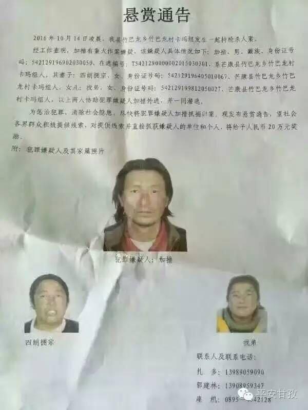 10月18日,甘孜藏族自治州公安局通過官方認證微信“平安甘孜”發(fā)布的通緝令顯示,經(jīng)工作查明,加措有重大作案嫌疑。加措生于1969年2月3日,芒康縣竹巴龍鄉(xiāng)竹巴龍村卡瑪組人,在逃編號為“T5421290000002015030301”。其妻子四朗擁宗和女兒找弟協(xié)助犯罪嫌疑人加措外逃,并一同潛逃。