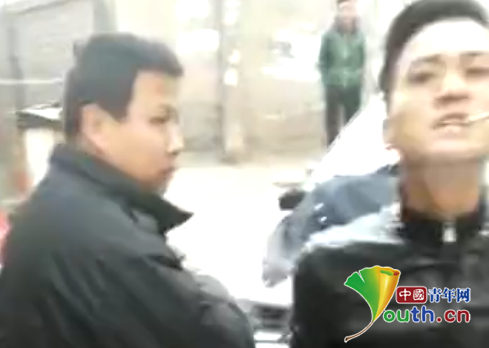 視頻中,與幾名穿黑衣制服男子一同出現的還有一輛沒有牌照、車門上印有“城管”字樣的車輛。在這段48秒的視頻中,一位身穿黑色制服的男子口出污言穢語近十次,并兩次上前推打視頻拍攝者。