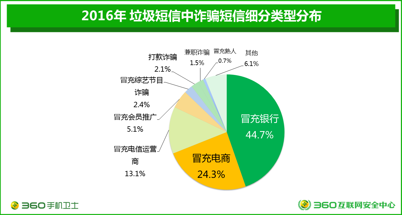 在最危險的詐騙類短信中,不法分子最愛冒充“官方”。其中,冒充銀行、冒充電商、冒充電信運營商成為不法分子心中的TOP3,分別占比44.7%、24.3%、13.1%。隨著技術(shù)和能力的提升,不法分子如今更擅長在詐騙短信中附加短網(wǎng)址,尤其是偽基站發(fā)出的詐騙短信,一旦用戶點擊,很可能緊接著是下載一個有病毒的安裝包,進而掉入騙子的陷阱,最終導(dǎo)致上當(dāng)受騙。