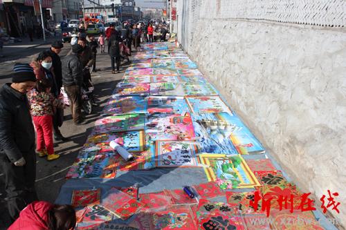 2月1日,在原平市新原鄉(xiāng)解放街村的農(nóng)貿(mào)市場(chǎng)上,村民們正在選購(gòu)年畫。過年了,不少農(nóng)村都在集市上選購(gòu)年畫、春聯(lián)、窗花、燈籠、掛件,準(zhǔn)備過個(gè)祥和喜慶的猴年春節(jié)。(曹申義 攝)