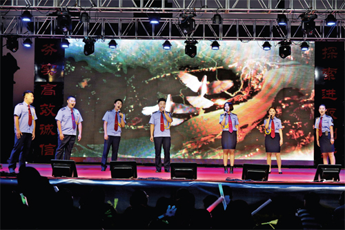 這場(chǎng)以“頌歌獻(xiàn)給黨,共圓中國夢(mèng)”為主題的文藝晚會(huì),是保安押運(yùn)人精心組織,自編、自導(dǎo)、自演的一臺(tái)節(jié)目,就像該公司黨委書記陳志平所說:“這場(chǎng)文藝晚會(huì)是我們保安押運(yùn)人向黨95歲華誕獻(xiàn)上的頌歌?!?月29日第一場(chǎng)晚會(huì)于晚8時(shí)正式上演,晚上7時(shí)便有觀眾陸續(xù)來到演出現(xiàn)場(chǎng)。第一場(chǎng)晚會(huì)就讓觀眾大呼過癮,節(jié)目形式多樣,有小合唱、獨(dú)唱、配樂詩朗誦、舞蹈、雙簧、小品、服裝秀等。其中舞蹈《映山紅》、男生獨(dú)唱《紅旗飄飄》、電聲樂隊(duì)《閃閃的紅星》歌曲串燒等用不同的藝術(shù)形式表現(xiàn)了保安押運(yùn)人對(duì)黨和祖國的熱愛之情,感染了現(xiàn)場(chǎng)的觀眾;而雙簧表演《文武雙全》將晚會(huì)現(xiàn)場(chǎng)氣氛推向高潮,兩位表演者夸張的表情、搞笑的扮相引得觀眾連連叫好。