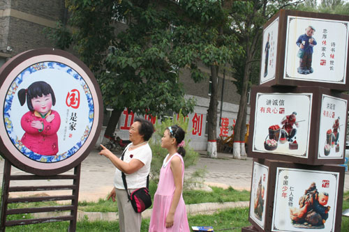 7月18日,原平市的家長正在忠孝園圖文并茂的宣傳圖畫前給孩子講解。該市通過多種形式的方法宣傳忠孝文化,讓市民們更加了解其傳統(tǒng)孝文化的內涵和傳統(tǒng)美德,代代相傳,煥發(fā)起人們更加熱愛祖國和熱愛人民。(趙春曉 攝)