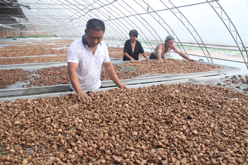 8月1日,原平市雙惠現(xiàn)代農(nóng)業(yè)示范園區(qū)日光溫室大棚內(nèi)工作人員正在整理雙孢菇進(jìn)行晾曬,制作成干蘑菇,準(zhǔn)備淡季銷售。該園區(qū)充分利用溫室晾曬有效聯(lián)接,延長(zhǎng)蘑菇銷售時(shí)間,增加菇農(nóng)收入。(褚震 攝)