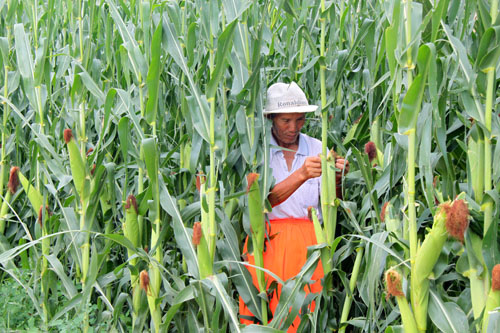 8月8日,原平市東野莊村農民正在查看長勢喜人,顆粒飽滿的玉米棒子,入秋,該市田野上大秋作物長勢喜人,到處是一派豐收景象,農民們高興地說,今年又是一個好年景好收成。(趙春曉 攝)