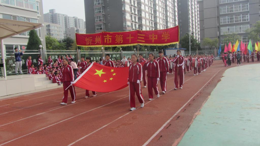 沐浴著秋天的朝陽,享受著清爽的秋風。9月28日上午,忻州市第十三中學第十一屆秋季運動會開幕式在學校操場隆重舉行。伴隨著激昂的運動員進行曲,國旗隊、鼓樂隊、彩旗隊、裁判員代表和運動員方隊秩序井然而又氣勢磅礴地走入會場。在莊嚴的國歌聲中,全體師生凝神肅立,齊唱國歌。鮮艷的五星紅旗在操場上冉冉升起。