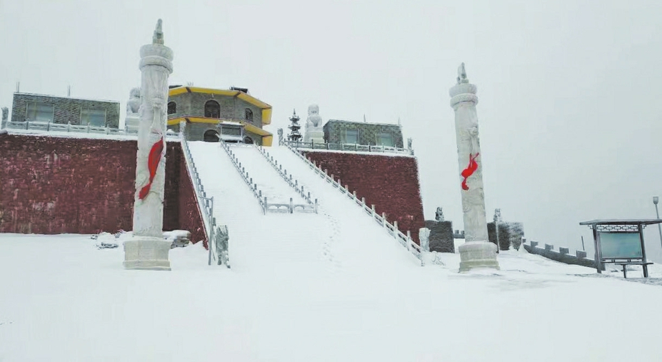 此次降雪主要分布在五臺山平均海拔2800米以上的五座臺頂。因為臺頂與臺懷腹地海拔相差1000米以上,所以時有“臺懷飄雨臺頂雪”的奇觀出現(xiàn)。東臺頂亦名望海峰,《清涼山志》載:“蒸云寢壑,爽氣澄秋,東望明霞,若陂若境,即大海也。亦見滄瀛諸州,因以為名。”望海峰是五臺山觀日出的絕佳位置。7日一大早,東方不見明霞,整個東臺頂銀裝素裹,霧靄茫茫,天籟梵音依舊,在圣潔的佛國仙境踏雪而行,更深切地感受人生一步一個腳印的意義。(本報記者 馬卓超 通訊員 覺一 攝影報道)
