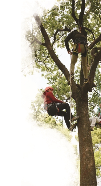 4月26日,蘇州市盤門景區(qū)里的一幕吸引了不少游客。景區(qū)香樟林里的一片區(qū)域,被隔離帶隔開,里面有兩棵比較粗壯的香樟樹,樹干上垂著多條繩索。12名全副武裝的學員,戴著安全頭盔、系著安全繩、穿著安全靴,在總教練的指導下,握著繩索開始往樹上攀爬。