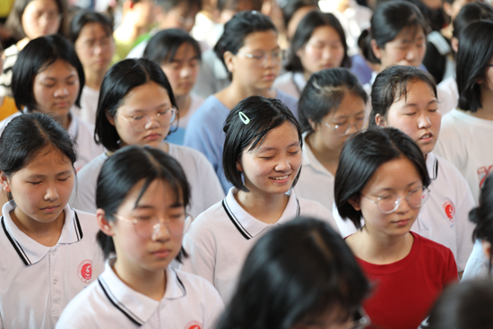 6月28日,湖南永州道縣第一中學(xué)學(xué)生在緊張準(zhǔn)備高考的同時,參加心理講座,開展快樂減壓活動。視覺中國供圖