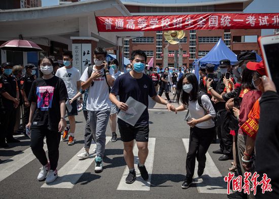 7月7日上午,北京市豐臺區(qū),北京市第十二中學考點,結束上午的考試后,高考考生們走出考場,一位考生從人群中牽起家人的手。當天是2020年全國統(tǒng)一高考第一天,據了解,今年北京市高考在7月7日至10日舉行,共49000多名考生,設17個考區(qū),132個考點學校,2867個考場,每考場考生人數由過去的30人減至20人。中青報·中青網記者 李崢苨/攝
